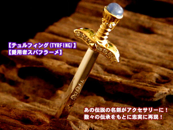 | ★商品詳細★縦幅(全長):約55ミリ(バチカン含む)最大横幅:約18ミリ重量:約8gバチカン内径:約3ミリ素材:Silver92518金鍍金天然石サファイヤ1石クリアージルコニア16石ブランド名:CV-SILVER※18G鍍金Silver925製チェーン(50cm)付き。※専用BOXにお入れしてお届けいたします。■伝説の名剣がここに甦る!■エクセレントソード(名剣)Pt【テュルフィング(TYRFING)】【愛用者スバフラーメ】●北欧神話でオーディンの血を引く【スバフラーメ】の名剣【テュルフィング】がシルバーアクセサリーになり復活!18金鍍金とソリッドなシルバー925製で鍛えあがられた作りにうっとりです。更に鞘部分には【天然サファイヤ】を埋め込んだこだわりの一品。高級感溢れるオトナのジュエリーペンダントをぜひご堪能下さい!【伝説の名剣が甦りました!】伝説の名剣を歴史文献を元に忠実かつ現代風にアレンジデザインして再現しました。刃の表裏にはそれぞれの【愛用者】と【剣名】を彫り込んであります。鞘部分は全ての種類において高級天然石を配備したこだわりのジュエリーペンダントになっています。細部まで丁寧な仕上がりで完成度は非常に高く、他にはない独特のデザイナーズペンダントとして周囲の目を引くこと間違いなし!【テュルフィング&スバフラーメ】 テュルフィングは北欧神話でオーディンの血を引くとされる スバフラーメがドバーリンとドーリンという二人の小人に 作らせた剣である。 柄は黄金で鉄を衣服のように切り裂き決して錆びることなく 必ず勝利をもたらす剣であった。しかしその力は恐ろしい 代償を必要とする。じつは二人の小人はこの剣に呪いをかけ この剣を抜いたものは必ず誰かを殺さねばならず持ち主の願いを 3つまでは叶えるが最後は自己を傷つけてしまうと云うものであった。 いわば呪われた、もろ刃の剣の意味合いを持った妖剣である。 【サファイヤ付きで高級感抜群!】この商品の鞘部分には天然サファイヤが埋め込まれています。サファイヤのストーンパワーをお守りにしてぜひ身に着けて下さい!サファイヤ旧約聖書にはラピスラズリとして記載があるがサファイヤ名称となったのは中世紀頃。硬度はダイヤモンドに次ぐ9を数える世界4大貴石。9月の誕生石。宝石言葉は、「幸運を運ぶ石。浮気封じ・信仰・高潔。」。この石を身につけていると、邪な考えや色欲を消す事ができ、僧侶や永久の平和を願う人たちが持つに相応しいとされる。愛の普遍を誓う誠実の石で持ち主に真実、献身と意志の強さを与えてくれるでしょう。また、サファイアを持っているだけで健康は回復し、持ち主を裏切るものがあればその力を失わさせ、闘争心を消し去ると云われています。 | ||||